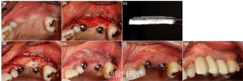 △ 그림 1. 이종 콜라겐 연조직 대체재 이식을 동반한 근단 변위 판막술을 통해 협측 구강 전정 깊이 및 협측 각화 점막 폭의 증대 증례. (a) 일차 수술 당시 골유도재생술을 동반 후 이차 수술을 앞두고 얕아진 협측 구강 전정 상태. (b) 협측 부분층 판막에 최소 1-2mm의 각화점막이 포함되도록 하여 판막을 형성 후, 수여부에 골막 천공을 시킨 위치에 맞춰 골막 봉합을 시행한 뒤, 치유지대주를 연결한 모습. (c) 이종 콜라겐 연조직 대체재의 모습. (d) 수여부 형태에 맞춰 연조직 대체재를 재단 후 골막 봉합으로 수여부에 고정한 모습. (e) 술 후 1주일 뒤 소독을 위해 내원 당시 치유 양상. (f) 술 후 2주일 뒤 봉합사 제거를 위해 내원 당시 치유 양상. (g) 보철물의 협측으로 충분한 깊이의 구강 전정과 비유동성 각화 점막이 형성된 모습.
