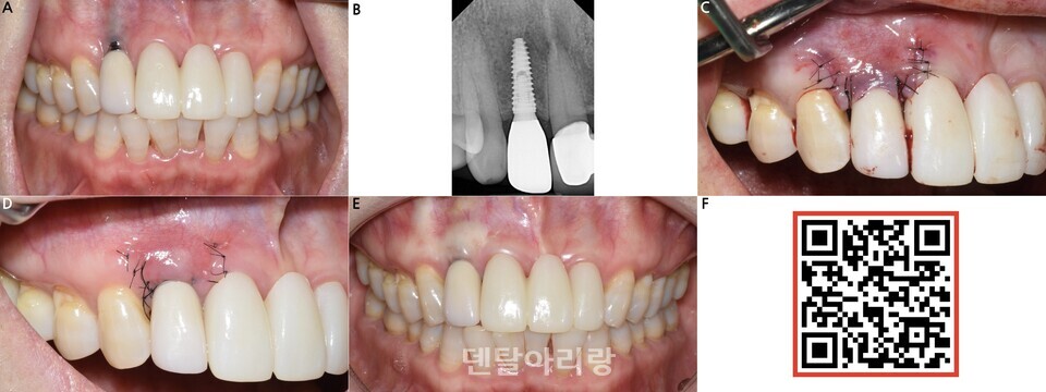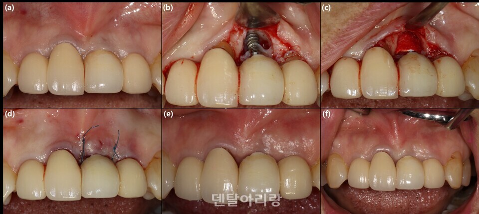 △ 그림 2. 임플란트 주위염에 이환된 부위에 염증 치료 후 이종 콜라겐 연조직 대체재를 이식하여 임플란트 주위 연조직 환경을 개선한 증례. (a) #21i 임플란트에 임플란트 주위염으로 인해 순측 점막 발적과 더불어 순측 중앙부에 누공이 관찰되는 모습. (b) 전층 판막 거상 후 관찰되는 임플란트 주위 병적 골흡수. (c) 골흡수 부위에 연조직 대체재를 적용한 모습. (d) 전층 판막을 제 위치로 봉합한 모습. (e) 술 후 2개월 후 모습. (f) 술 후 6개월 후 건강한 각화 점막에 의해 피개된 상태로 유지 중인 #21i 임플란트의 모습.