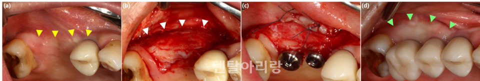 △ 그림 3. 골막 천공 (periosteal fenestration). (a) 이차 수술을 앞두고 얕아진 협측 구강 전정 상태 (노란색 화살표: 치관 측으로 올라간 mucogingival junction). (b) 각화 점막을 협측 부분층 판막을 거상한 후 수여부 상 판막을 고정할 위치에 15번 surgical blade의 예리한 날로 하방 경조직을 느껴가며 골막을 끊어내듯 절개를 그어 (흰색 화살표) 골막 천공을 시행한 모습. (c) 치유지대주를 체결 후 골막 천공을 시행한 위치에 협측 부분층 판막을 골막 봉합으로 고정한 모습. (d) 골막 천공 부위가 향후 scar tissue로 치유됨으로써 mucogingival junction이 근단 방향으로 변위된 상태 (녹색 화살표)로 유지되며, 보철물의 협측으로 충분한 깊이의 구강 전정과 비유동성 각화 점막이 형성된 모습.