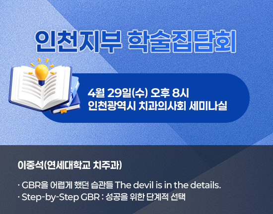 공지사항 2026 인천지부 학술집담회(4/29) 조회수 : 10 게시일 : 2026-04-21 목록 이전글 2026 KAOMI - OSSTEM 수요세미나(~6/24) 다음글 다음글이 없습니다.