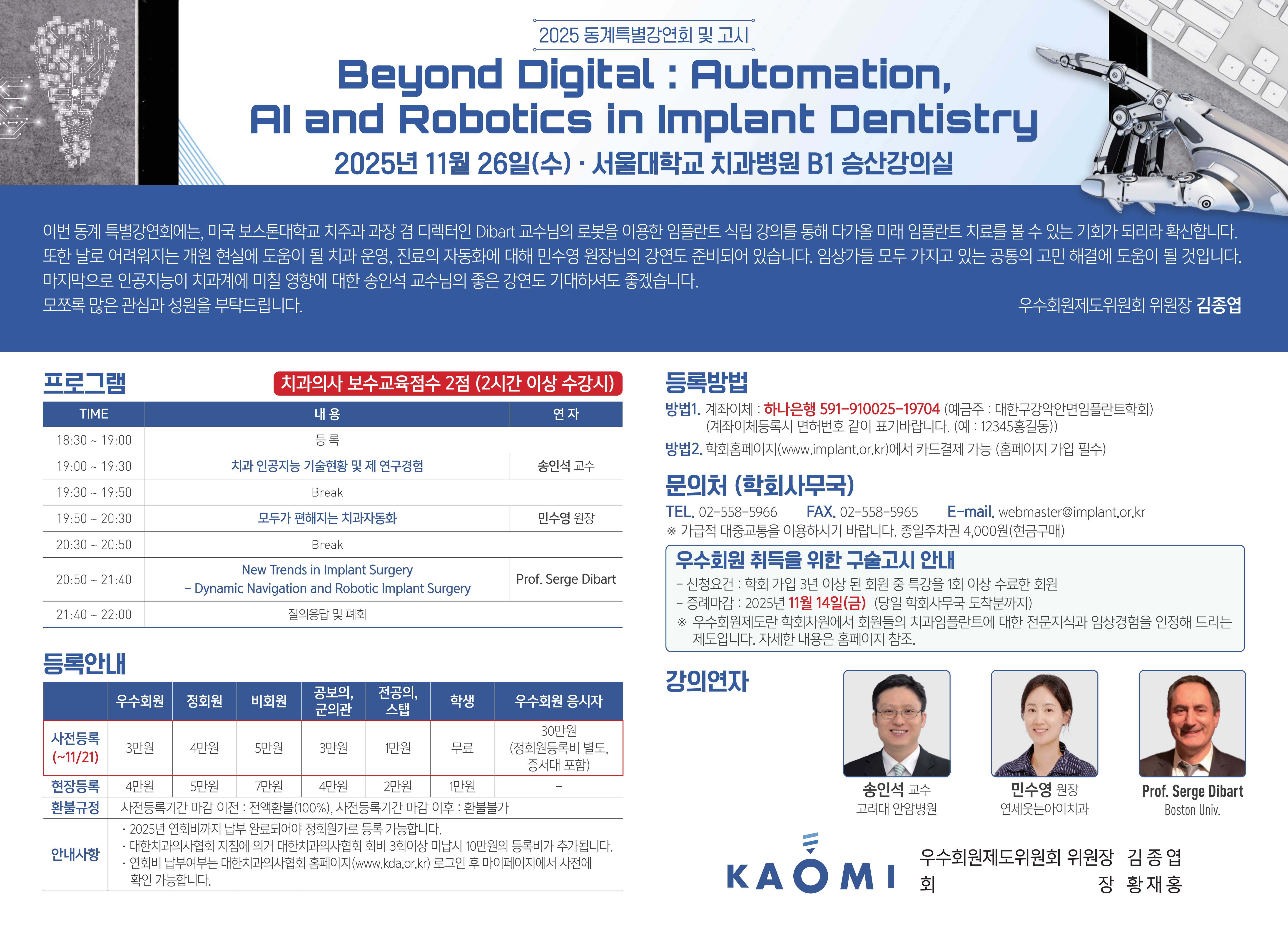 학술대회 등록 및 안내 2025동계특별강연회 일시 : 2025년 11월 26일(수) 장소 : 서울대학교 치과병원 B1 승산강의실 공지사항 행사개요 공지사항 등록 신청 및 확인 (Registration) 오시는 길 파일 다운로드