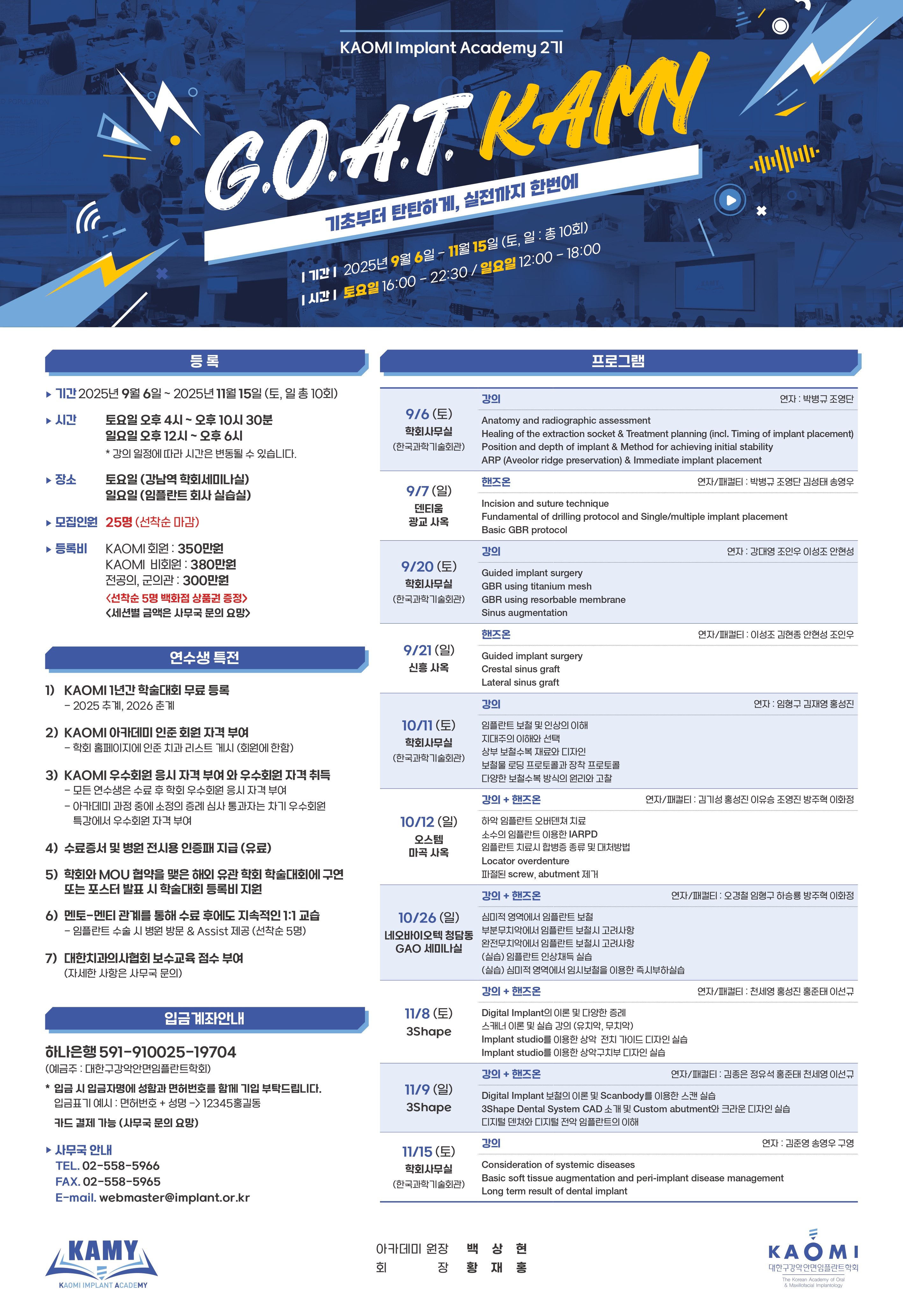 학술대회 등록 및 안내 2025 KAOMI Implant Academy (KAMY) G.O.A.T 일시 : 2025년 09월 06일(토) ~ 2025년 11월 15일(토) 장소 : 학회세미나실, 임플란트 회사 실습실 프로그램 행사개요 프로그램 공지사항 등록 신청 및 확인 (Registration)